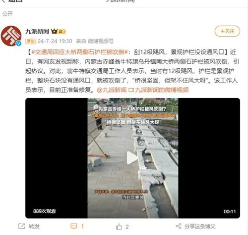 【內蒙古一橋梁護欄被12級大風吹倒】近日,有網友發視頻稱,內蒙古赤峰翁牛特旗烏丹鎮南大橋兩側石護欄被風吹倒,引起熱議。對此,翁牛特旗交通局工作人員表示,當時有12級颶風,護欄是景觀護欄,整塊石塊沒有通風口,就被吹倒了,“橋很堅固,但架不住風大呀”。該工作人員表示,目前正準備修復。