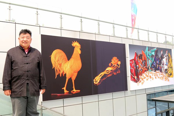(中國工藝美術大師、津派花絲第四代傳人王鵬與其作品合影)