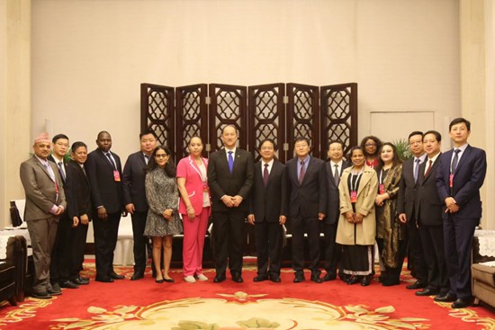 中國互聯網新聞中心主任王曉輝、濟源示范區管委會主任、市長莊建球共同會見參加博覽會的“一帶一路”國家駐華使節。攝影:邢圣愛