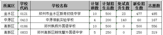 鄭州市金水區勤禮初級中學、鄭州市金水區一八初級中學、鄭州市金水區勵德雙語初級中學、鄭州市金水區建業外國語初級中學、鄭州市金水區經緯學校、河南少年先鋒學校、鄭州市金水區新棟外國語學校、鄭州市中原區二砂實驗學校、鄭州市中原區西斯達城市森林學校、鄭州市二七區鄭達實驗學校、鄭州市二七區國際城中學、鄭州市二七區綠地愛華學校、鄭州市二七區滬華國慶學校、鄭州市管城回族區嵩陽學校、鄭州市管城回族區啟元中學、鄭州陳中實驗學校、鄭州市惠濟區森林湖學校、鄭北一中學校、鄭州市鄭中國際學校、鄭州長明中學、鄭州國慶中學、鄭州經開區致遠中學、鄭州市鄭東新區上海師范大學附屬鄭州啟佳學校、河南省實驗學校裕鴻國際學校、鄭州航空港區英迪雙語學校、鄭州航空港育人國際學校。