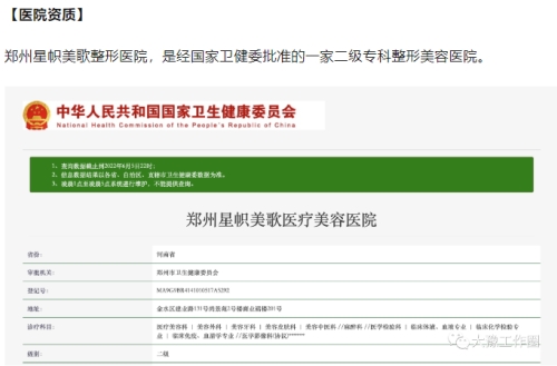 公開信息顯示,鄭州星幟美歌醫療管理有限公司成立于2021年01月12日,法定代表人為李揚揚。經營范圍包括醫療美容服務;技術進出口;貨物進出等項目。據中博人才網微信公眾號發布的關于該公司的招聘信息顯示,該美容醫院是經國家衛健委批準的一家二級??普蚊廊葆t院。然而,記者查詢發現,鄭州星幟美歌醫療美容醫院資質卻為鄭州市衛健委所批。