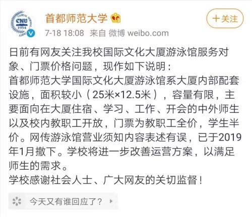 游泳館只接待留學生?首師大:營業須知表述有誤
