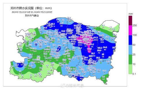 據@鄭州氣象,7月22日16時至23日3時,鄭州出現短時強降水、雷暴大風。最大降水為151.5毫米,最大小時雨強76.4毫米。此外,鄭州還出現了雷暴大風,平均風力5-6級,陣風9-10級。全市有46個自動站極大風速達到7級以上。