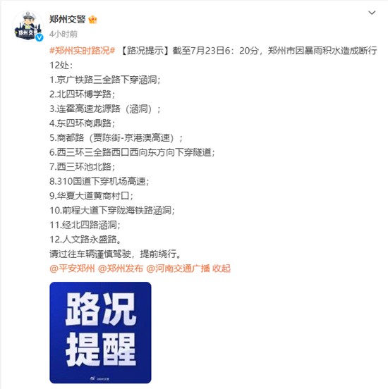 值得注意的是,鄭州此次暴雨積水還造成了多處道路斷行。據@鄭州氣象 最新消息,今天(7月23日)鄭州依然有分散性陣雨、雷陣雨。
