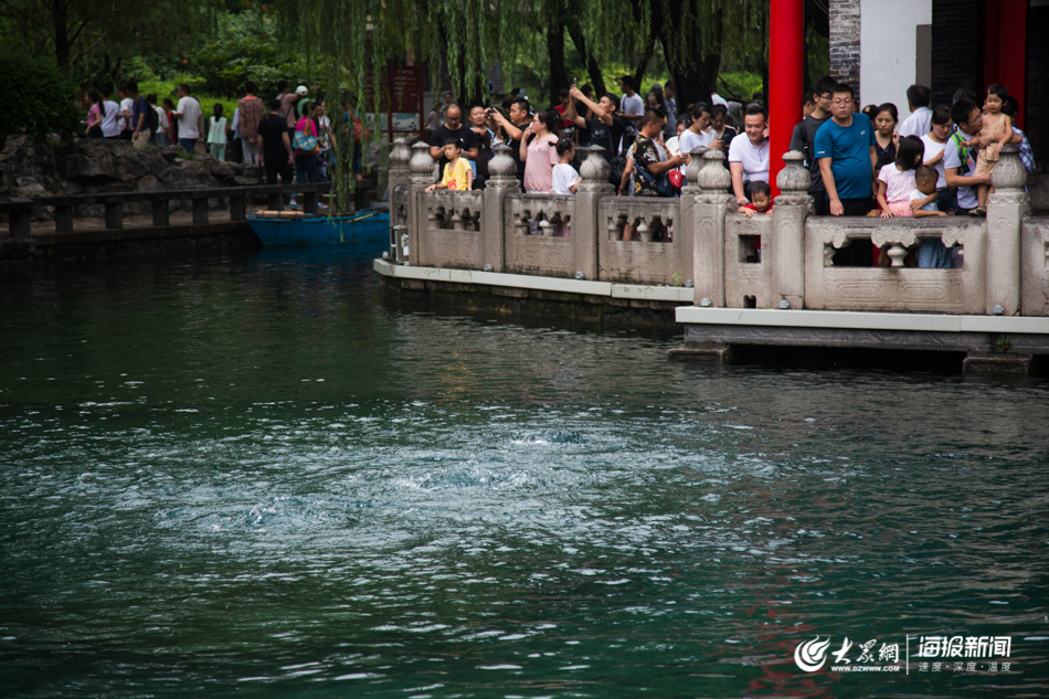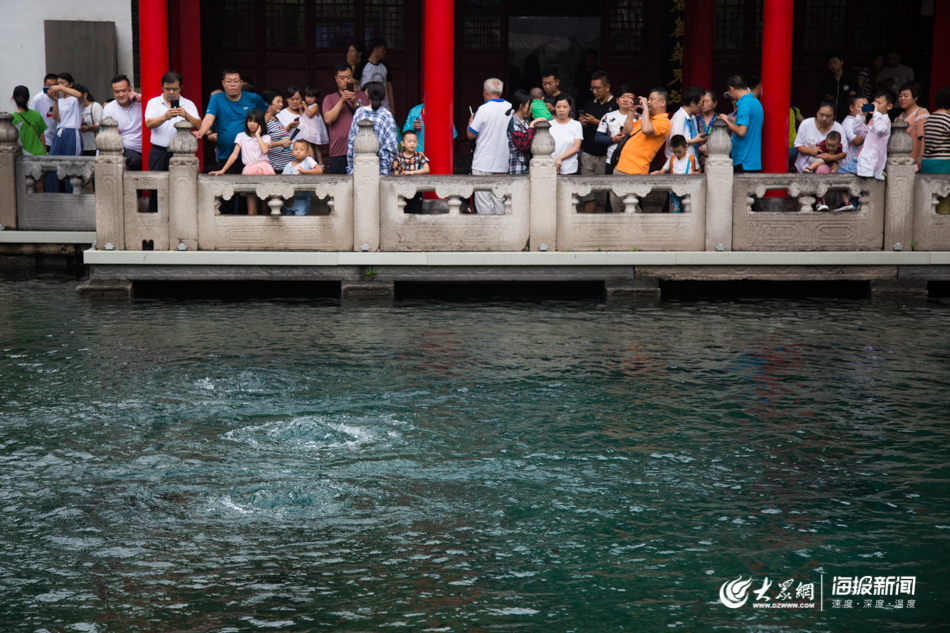 下午,記者在趵突泉公園內看到,三股泉水歡騰噴涌,泉池周邊擠滿了前來賞泉的游客。