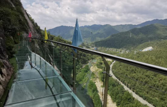 五道幢景區內2018年5月建成中原最長5D玻璃棧道,棧道位于景區內刀棱山中段,整條玻璃棧道沿著絕壁修建而成,全長1200米,寬1.8米,路面采用聲、光、電等高科技5D技術展示,游客登臨玻璃棧道,心驚肉跳,體驗絕佳!