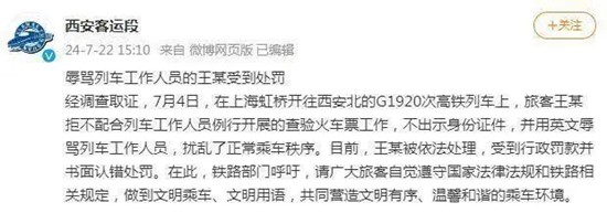 經調查取證,7月4日,在上海虹橋開往西安北的G1920次高鐵列車上,旅客王某拒不配合列車工作人員例行開展的查驗火車票工作,不出示身份證件,并用英文辱罵列車工作人員,擾亂了正常乘車秩序。目前,王某被依法處理,受到行政罰款并書面認錯處罰。