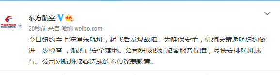 東航紐約至上海浦東一航班因故障返航 已安全落地
