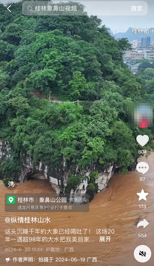漓江邊有一處桂林知名景點象鼻山,有攝影師拍攝到象鼻山水月洞差一點就要被洪水淹沒的畫面。有網友擔心,經過洪水沖刷浸泡,水月洞象鼻造型會被破壞。
