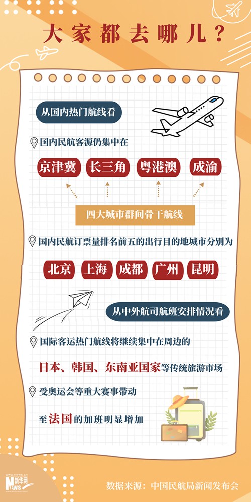 關于國際熱門航線,預計今年暑期民航將繼續迎來國際旅游、留學出行市場旺季。徐青表示,從中外航司航班安排情況看,國際客運熱門航線將繼續集中在周邊的日本、韓國、東南亞國家等傳統旅游市場;受奧運會等重大賽事帶動,至法國的加班明顯增加,此外各航司在至丹麥、匈牙利、希臘等國航線上客運加班也有明顯增加。