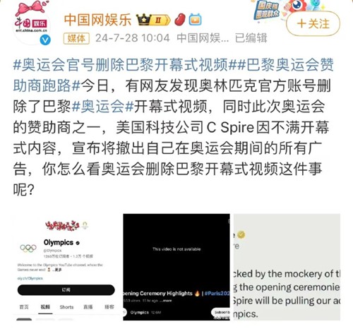 28日,有網友發現奧林匹克官方賬號刪除了巴黎奧運會開幕式視頻,同時此次奧運會的贊助商之一,美國科技公司C Spire因不滿開幕式內容,宣布將撤出自己在奧運會期間的所有廣告。